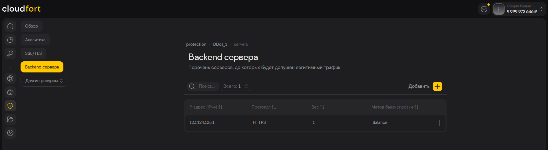 Вернитесь к опциям ресурса Защиты от DDoS и выберите пункт «Backend-сервер». Здесь Вы сможете отредактировать добавленные сервера, сделать их временно неактивными или удалить. При необходимости Вы также можете добавить новые сервера. При добавлении нового сервера укажите его параметры аналогично тому, как Вы указывали их при создании ресурса в параграфе Подключение услуги «Защита от DDoS». Как разобраться?
