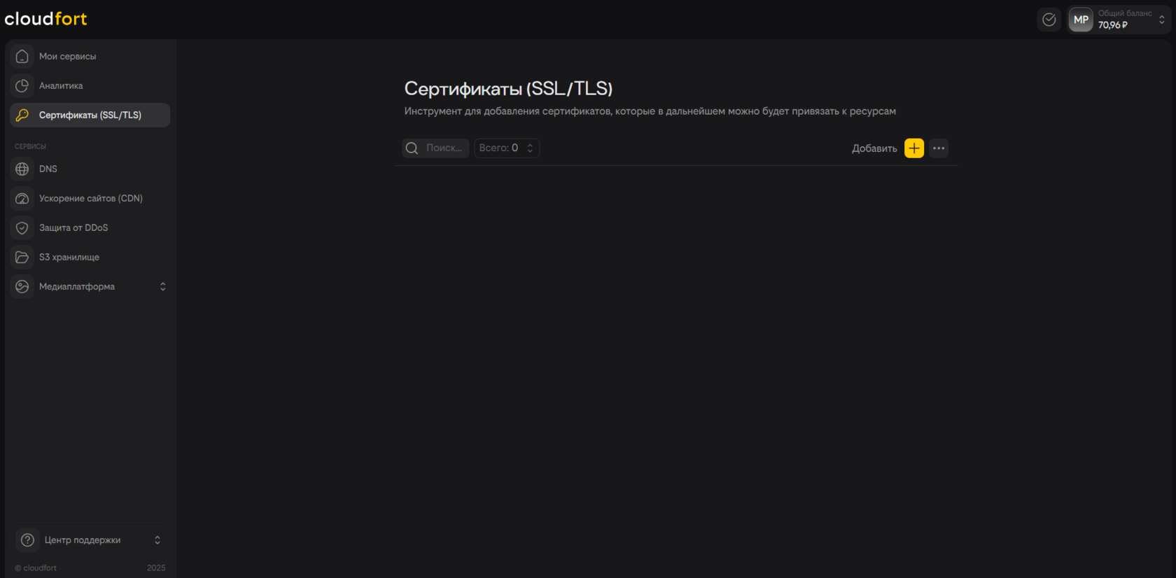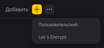 Вы можете добавить два вида сертификатов: Пользовательский сертификат и бесплатный сертификат Let’s Encrypt.