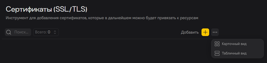 Здесь будут отображаться Ваши сертификаты после того, как Вы их добавите. Среди них можно будет осуществить поиск, а также изменить отображение, нажав на иконку троеточия: карточный вид или табличный вид.