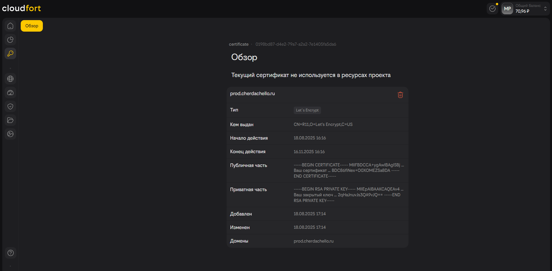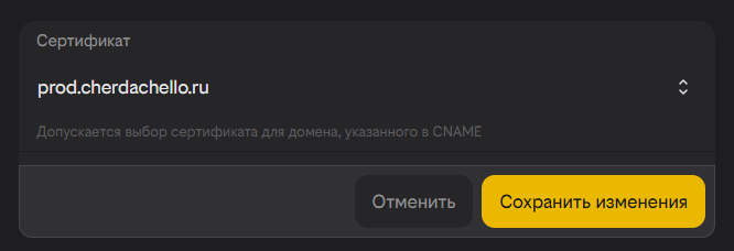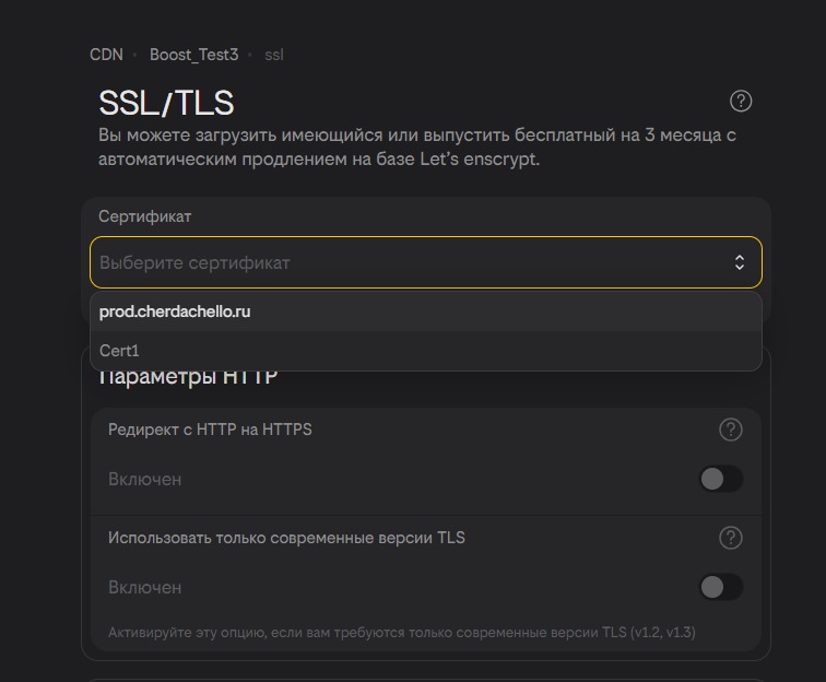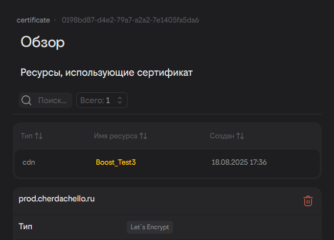 Чтобы использовать сертификат, перейдите в ресурс, использующий CNAME, соответствующий домену в сертификате. Рассмотрим на примере CDN-ресурса: