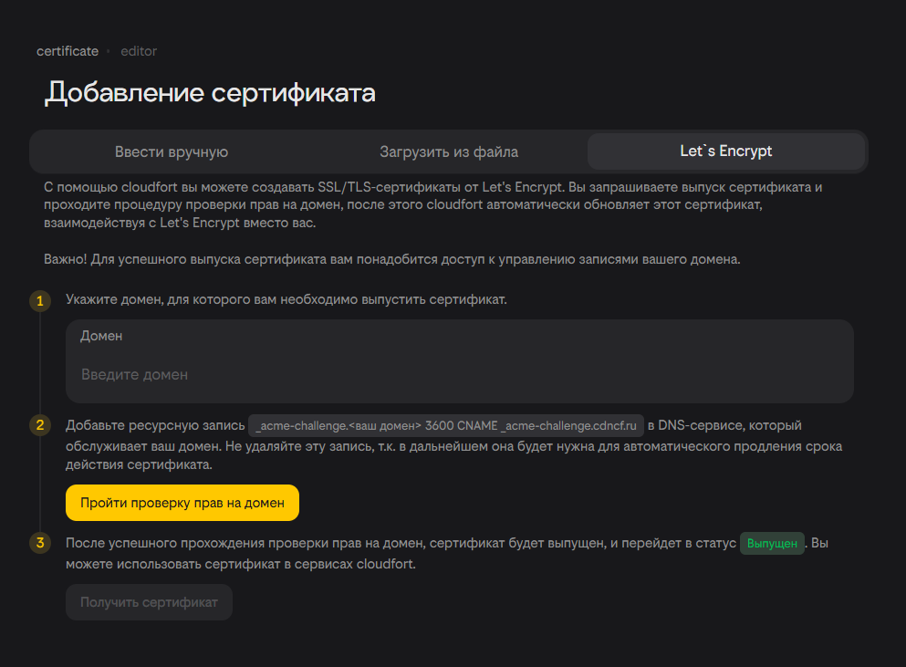 С помощью cloudfort Вы можете создавать SSL/TLS-сертификаты от Let's Encrypt. Вы запрашиваете выпуск сертификата и проходите процедуру проверки прав на домен, после этого cloudfort автоматически обновляет этот сертификат, взаимодействуя с Let's Encrypt вместо вас.
