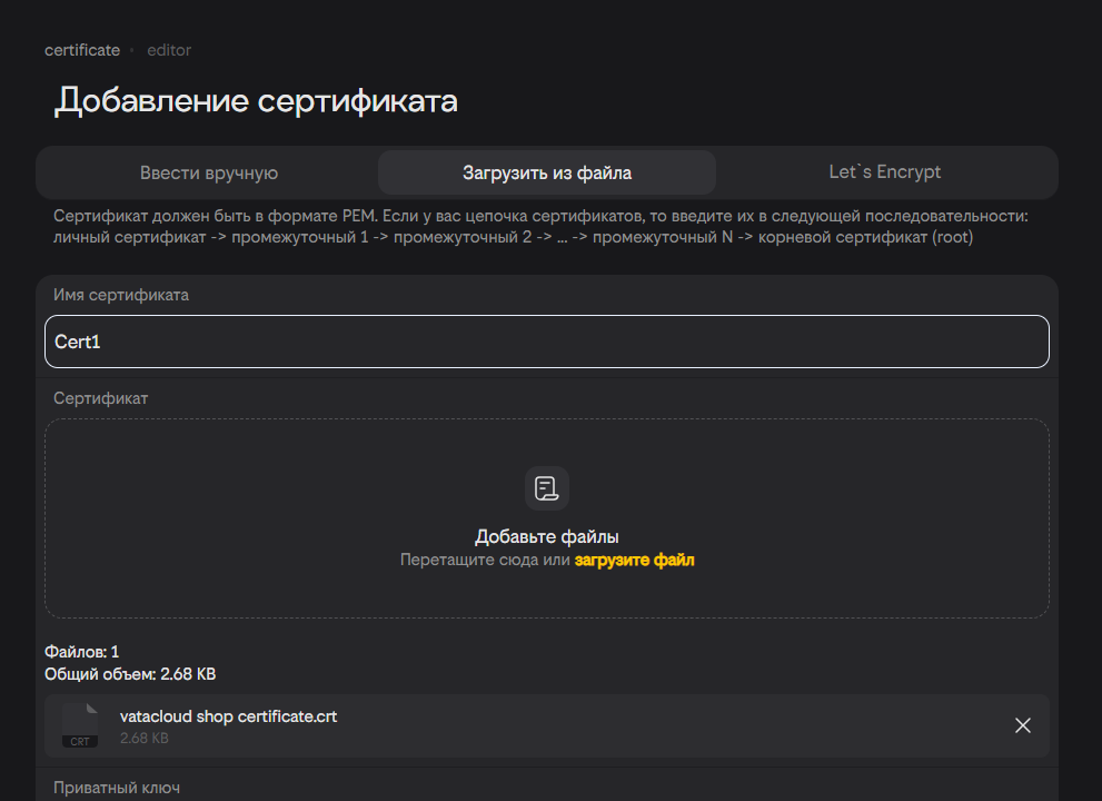 В соответствующей строке сверху укажите имя SSL-сертификата. Затем заполните поля «Сертификат» и «Приватный ключ». Вы можете сделать это вручную или автоматически перенести данные из файла, нажав на кнопку «Загрузить из файла» и выбрать файл или просто перетащить файл в окно.