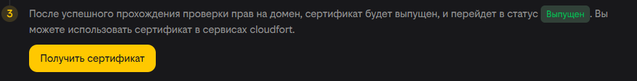 Нажмите кнопку «Пройти проверку прав на домен». Если проверка будет успешной, нажмите «Получить сертификат».