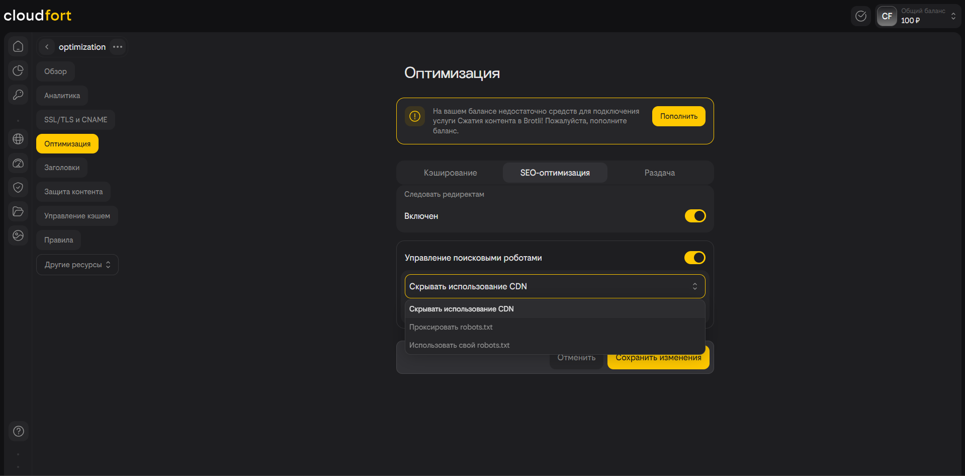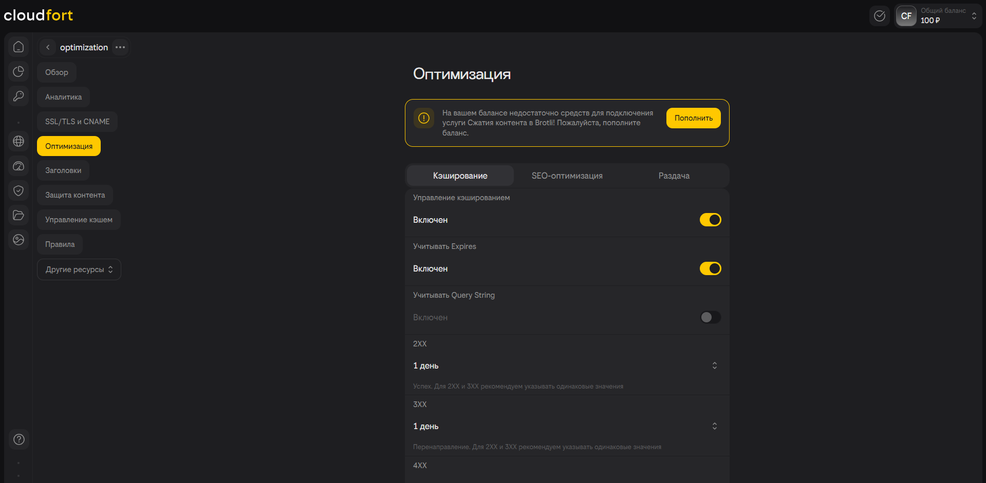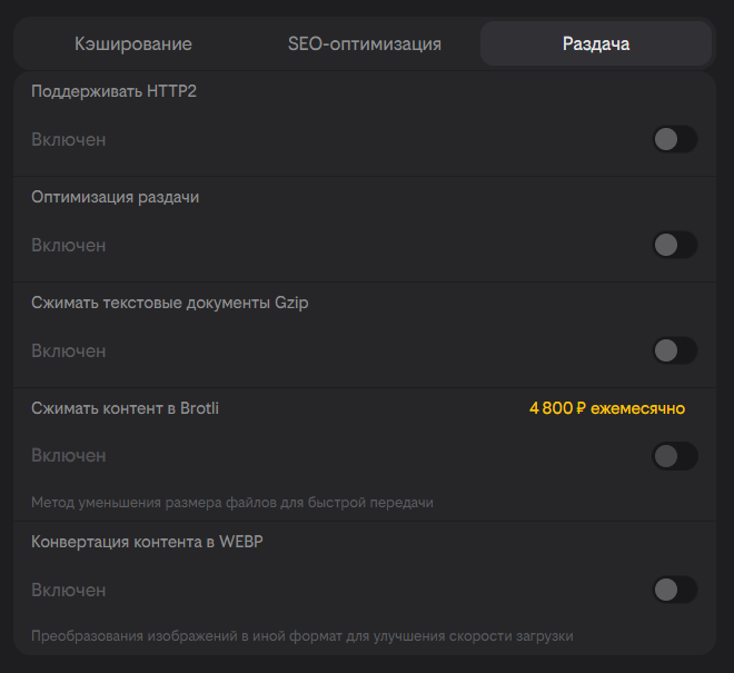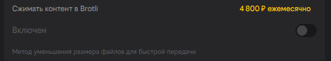Обращаем внимание, что сжатие контента в Brotli является платным. Подробнее о подключении платных опций Вы можете узнать в разделе «Биллинг».