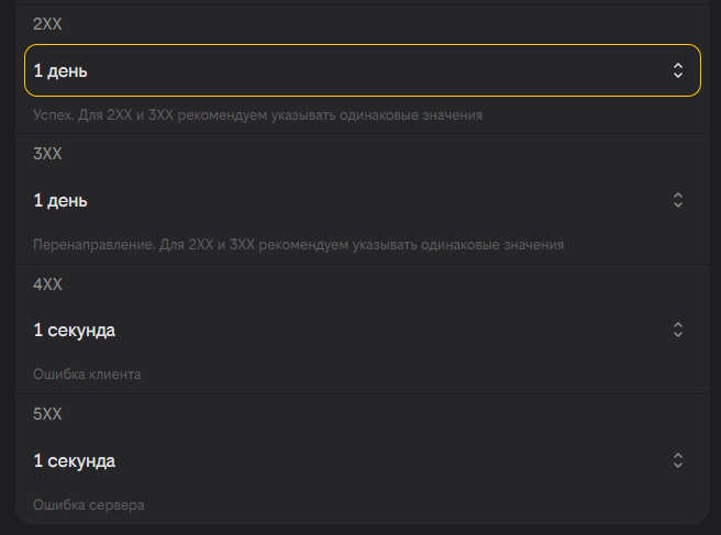 Шаг 3. Вы можете настроить время кэширования для каждого статуса ответа HTTP (2ХХ, 3ХХ, 4ХХ и 5ХХ), выбрав в раскрывающемся списке значения от 1 секунды до 30 дней.
