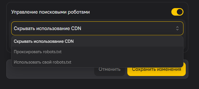 2. Настройка «Проксировать robots.txt» скажет CDN, что нужно получать файл robots.txt с источника и отдавать его поисковому роботу, при этом не скрывая использования CDN.