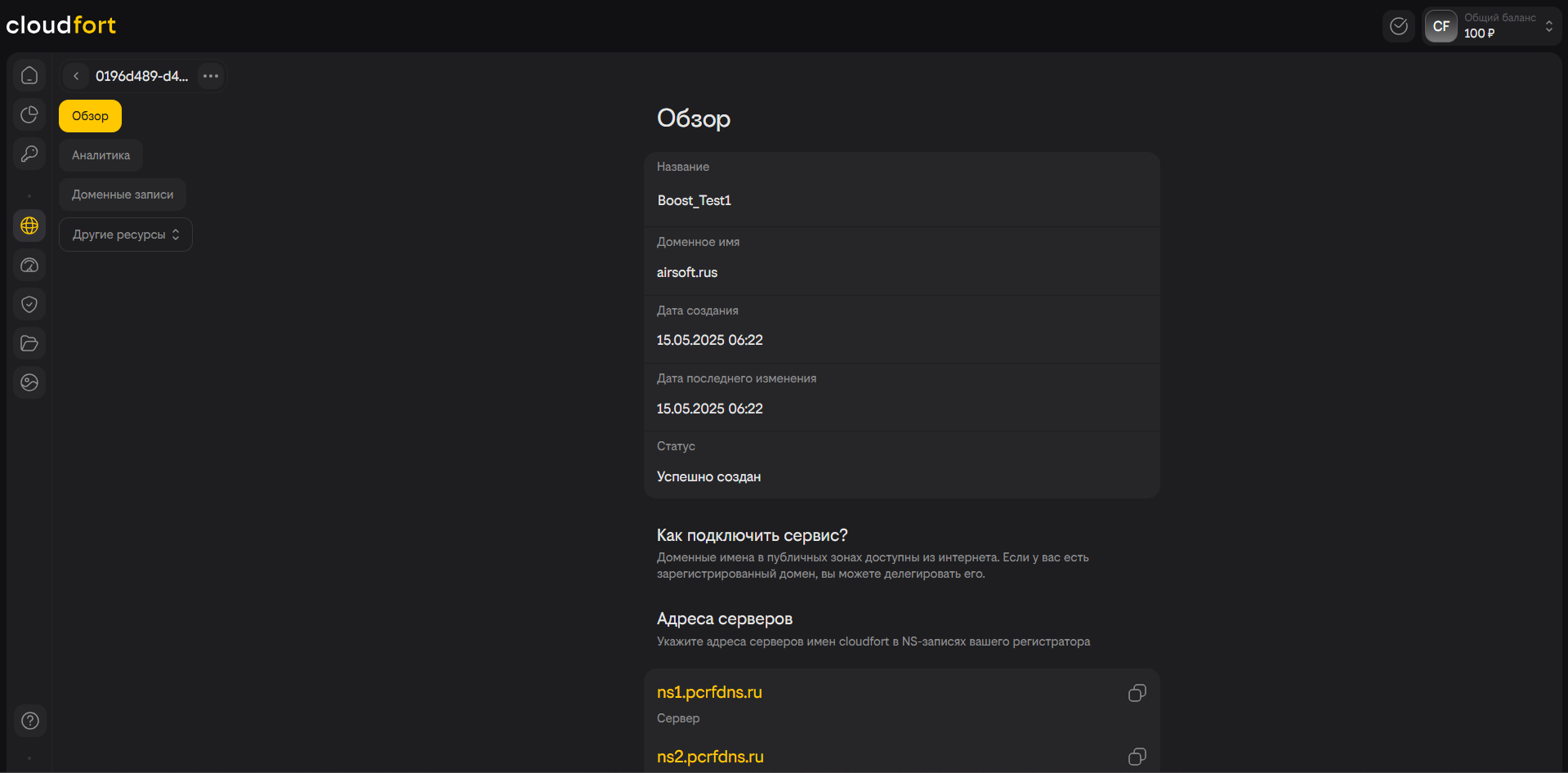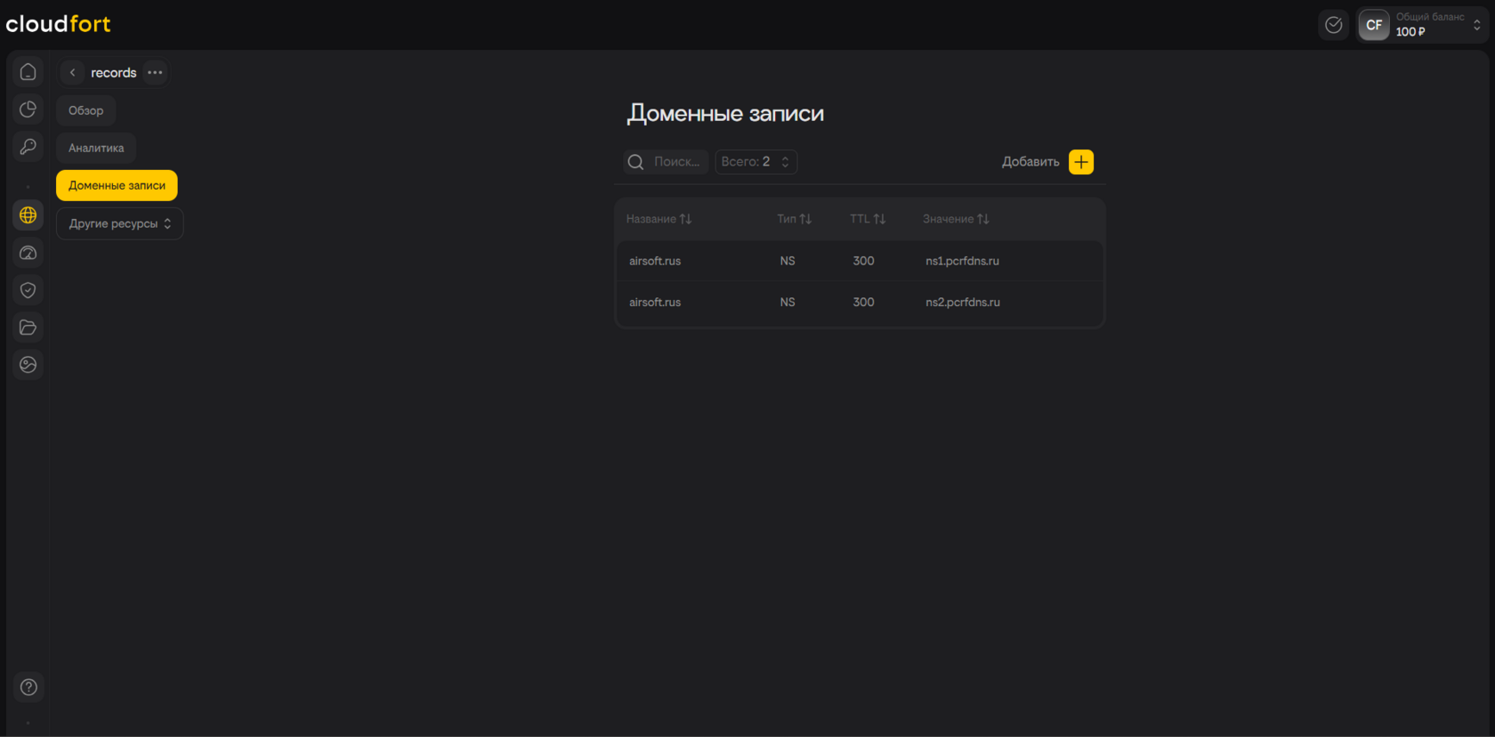 Шаг 3. При создании ресурса автоматически добавляются две служебные NS-записи, которые нельзя редактировать или удалять. Они нужны для подтверждения делегирования DNS-зоны на сервис доменных имен cloudfort. Чтобы сервис «Распределённый DNS» заработал, необходимо у Вашего регистратора домена делегировать DNS-зону, прописав две NS-записи: ns1.pcrfdns.ru и ns2.pcrfdns.ru.
