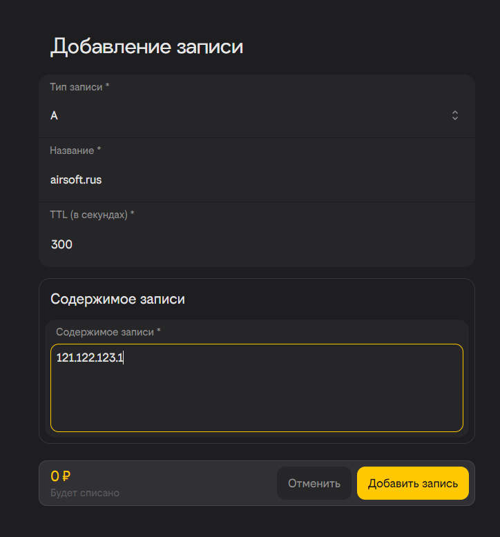 После названия записи укажите её время жизни (TTL) в секундах и задайте содержимое, затем нажмите «Добавить запись».