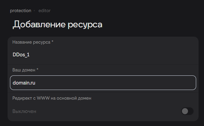 Шаг 2. Введите название ресурса и укажите домен, который необходимо защитить. Если необходим редирект с WWW на основной домен, включите соответствующий свитчер.