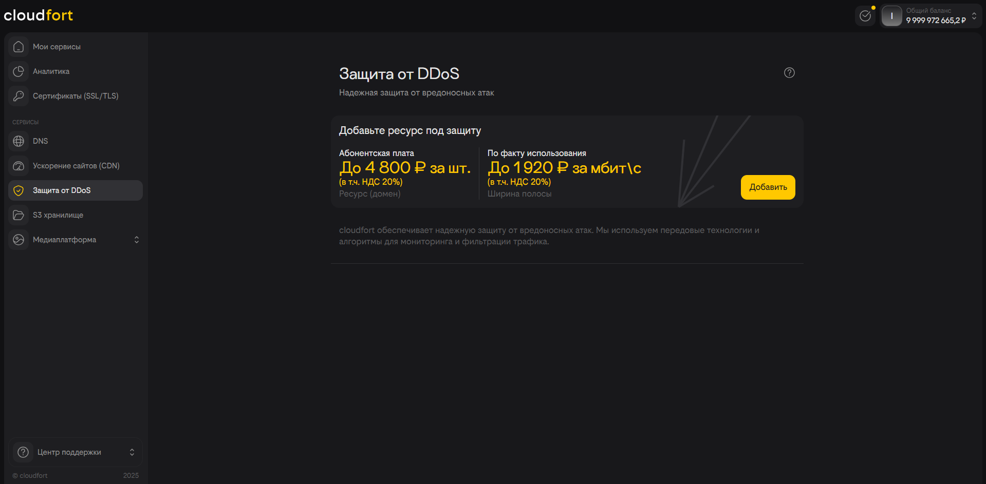 Шаг 1. Чтобы подключить защиту от DDoS, перейдите в главное меню и в колонке «Сервисы» слева выберите «Защита от DDoS». Обращаем внимание, что опция является платной.