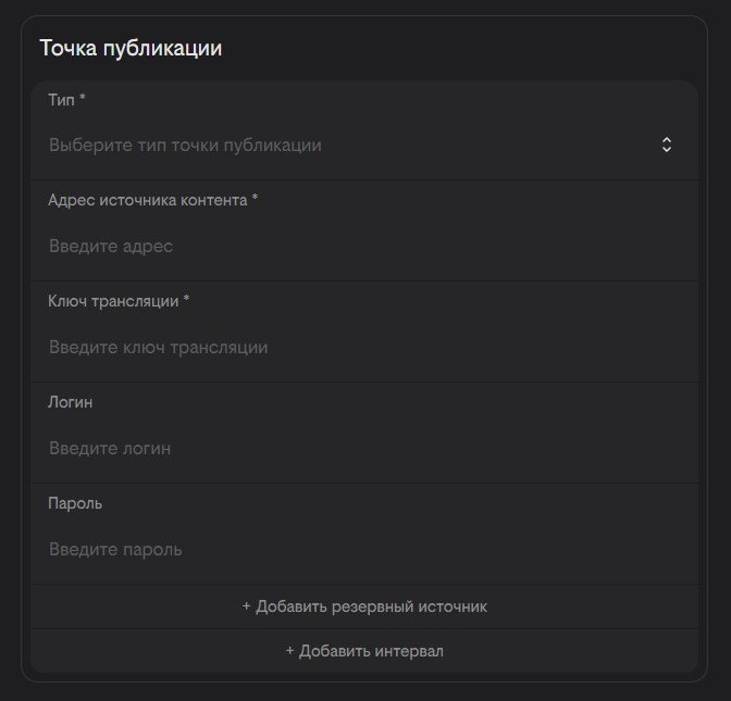 Вам может быть необходимо задать логин и пароль для точки рестриминга. По желанию Вы можете указать интервал рестриминга в окошке с календарём, чтобы трансляция началась и завершилась по расписанию. Можно добавить несколько интервалов, нажав на кнопку «+ Добавить интервал»