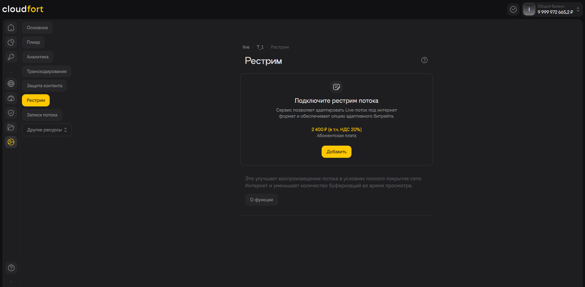 Шаг 1. Выберите Live-ресурс, при создании которого Вы указали метод доставки потока RTMP- или SRT-publish, зайдите в его настройки. В левом меню опций выберите пункт «Рестриминг потока» и нажмите справа кнопку «Добавить». Обращаем внимание, что опция является платной.