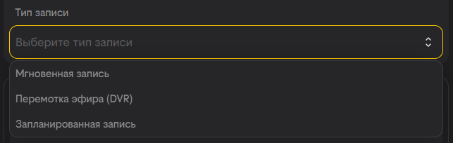 На платформе существует три типа записей Live-трансляций: мгновенная запись, запись с возможностью перемотки и отложенная запись. Мгновенной записи необходимо задать её длительность, после чего она будет запущена автоматически. Записи с возможностью перемотки не нужно задавать длительность, однако ей необходимо задать глубину перемотки — то, насколько свободно сможет пользователь перемещаться по записи во время просмотра прямого эфира. Отложенной (запланированной) записи нужно задать время, в которое она начнётся и закончится, после чего в указанный момент она запустится и прервётся автоматически.