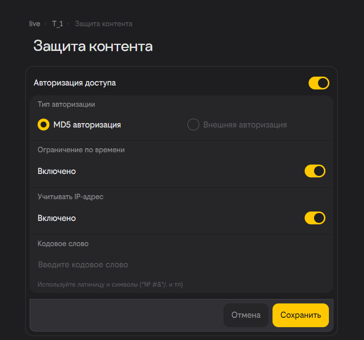 Шаг 2. Если Вы выбрали MD5 авторизацию (локальная авторизация), обратите внимание на правила, согласно которым будут генерироваться ссылки для доступа к Вашему контенту. Включив свитчер «Ограничить по времени», Вы ограничите время действия ссылки (опционально). Включив свитчер «Учитывать IP адрес», Вы позволите алгоритму авторизации проверить, что ресурс запрошен именно с того IP-адреса, для которого была сформирована ссылка (опционально). Также обязательно укажите кодовое слово.