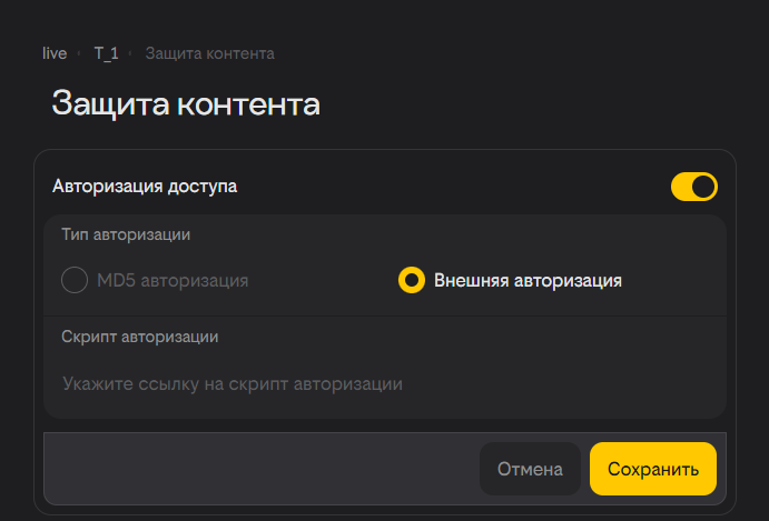 - Внешняя авторизация. Используя этот способ, Вам необходимо указать ссылку на свой скрипт авторизации. Узлы CDN будут при каждом запросе проводить валидацию: можно ли отображать контент конкретному пользователю или нет.