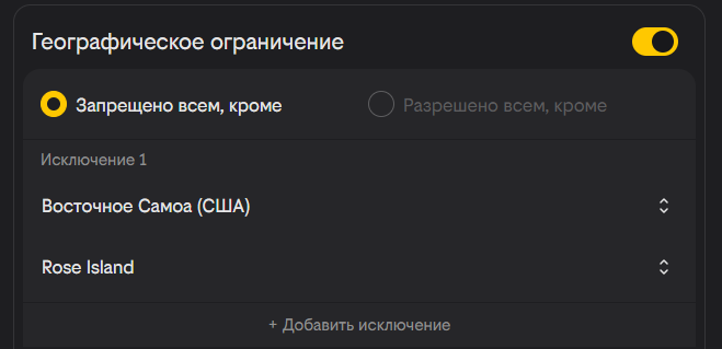 3 - Добавьте исключения из правила по умолчанию. Для географического ограничения также выберите правило для самого исключения. Таким образом Вы можете, например, запретить раздачу Вашего контента для всей страны, при этом разрешить её для отдельного региона.