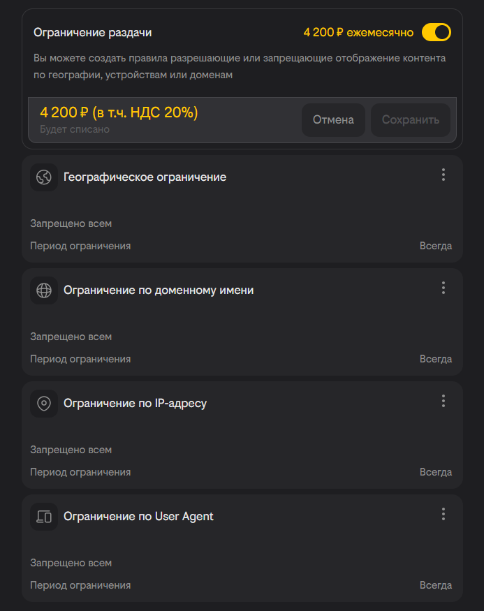 Шаг 2. Cloudfort предлагает Вам четыре независимых пункта настройки ограничения раздачи: «Географическое ограничение», «Ограничение по IP», «Ограничение по домену» и «Ограничение по User Agent».