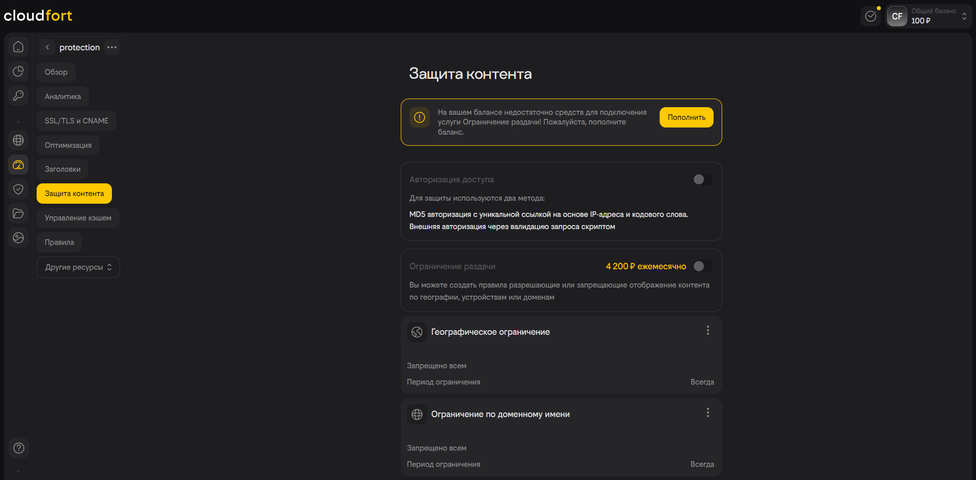 Шаг 1. Откройте необходимый CDN-ресурс и перейдите во вкладку «Защита контента». Включите соответствующий свитчер, чтобы использовать опцию.
